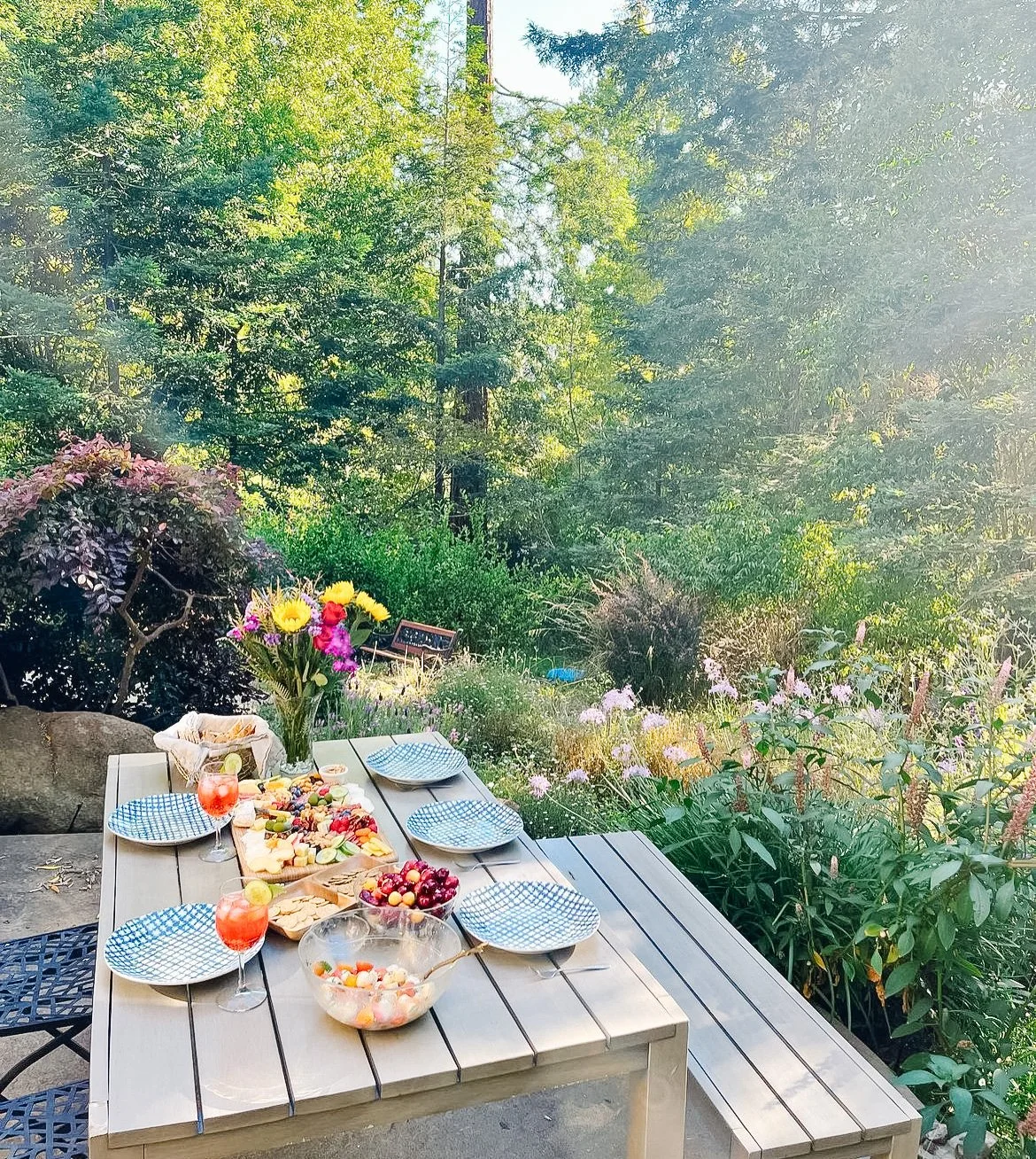 Outdoor meals are a great opportunity to switch it up and eat family style, which helps with not having to schlep an entire dinette set back and forth across your yard. Whether you’re eating on a blanket in the grass, on proper picnic tables, or anything in between, think about your setting and your surfaces, and choose things that will work well with your scene.